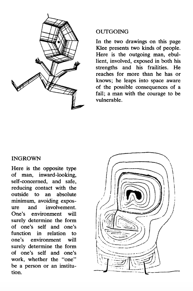 But there is really no choice without action. Without action it will always be a hypothetical, the resistance that action comes up against is what makes it real. In Paul Klee’s outgoing vs ingrown man1, it is interesting to look at how these characters indicate the direction of their layers.